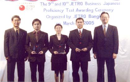 นายอะทสึโอะ คุโรตะ (ขวาสุด) ประธานองค์การส่งเสริมการค้าต่างประเทศของญี่ปุ่น หรือ เจโทร กรุงเทพฯ พร้อมด้วย ศ.ดร.วิวัฒน์ ตัณฑะพานิชกุล (ซ้ายสุด) รองประธานสมาคมส่งเสริมเทคโนโลยีมอบโล่ประกาศเกียรติคุณและประกาศนียบัตรแก่ น.ส.วรลักษณ์ ธรรมานิชานนท์ (กลาง) ชาวไทยผู้ทำคะแนนวัดระดับภาษาญี่ปุ่น ธุรกิจ JETRO Test ครั้งที่ 10 ได้เป็นอันดับหนึ่งของโลก ไม่นับประเทศญี่ปุ่น และเป็นอันดับแปดหากรวมประเทศญี่ปุ่น เมื่อเร็วๆ นี้