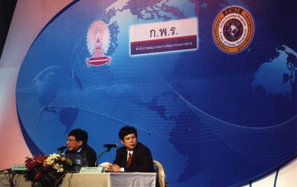 คุณอัศวิน วราทร ผู้จัดการทั่วไป กรรมการบริหาร บริษัท ที. เอ็น. อินฟอร์เมชั่น ซิสเท็มส์ จำกัด (ขวา) และผู้แทนโครงการ GFMIS ดร.วิเทศ เตชางาม ผู้ช่วยกรรมการผู้จัดการ บริษัท กรุงไทย คอมพิวเตอร์เซอร์วิส จำกัด จับมือกับสำนักงานคณะกรรมการพัฒนาระบบราชการ (กพร.) ในกรร่วมบรรยายในหัวข้อ “การบริหารการเงินและควบคุมโครงการระบบการบริหารการเงินการคลังภาครัฐ และระบบเบิกจ่ายดว้ยอิเลคทรอนิกส์ (GFMIS) และการบริหารโครงการ”