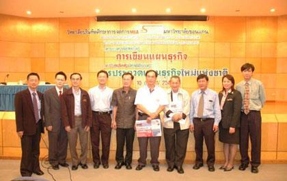 นายสุรพล ทวีแสงสกุลชัย (ที่ 5 จากขวา) ประธานหอการค้าจังหวัดขอนแก่น พร้อมด้วย รศ.ดร.วินิต ชินสุวรรณ (ที่ 3 จากขวา) ผอ.วิทยาลัยบัณฑิตศึกษาการจัดการ มหาวิทยาลัยขอนแก่น ให้การต้อนรับ ผศ.ดร.อรรณพ ตันละมัย (ซ้ายสุด) ประธานโครงการ MBA จุฬาลงกรณ์มหาวิทยาลัย และนายสุวัฒน์ ทองธนากุล บก.อำนวยการ นสพ.ผู้จัดการรายสัปดาห์ ในโครงการ Moot Biz 2006 สัญจรจังหวัดขอนแก่น เพื่อเสริมสร้างความรู้ความเข้าใจในเรื่องการเขียนแผนธุรกิจและการนำเสนอแผนธุรกิจที่ดีให้กับนิสิตนักศึกษาในระดับปริญญาโท ที่ต้องการเป็นผู้ประกอบการรุ่นใหม่