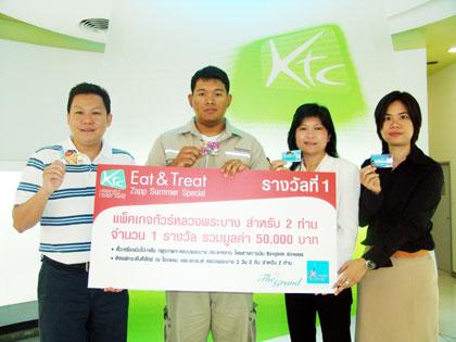นายวรวุฒิ นิสภกุลธร (ซ้าย) ผู้ช่วยประธานเจ้าหน้าที่บริหาร สายการตลาดธุรกิจ บัตรเครดิต “เคทีซี” หรือ บริษัท บัตรกรุงไทย จำกัด (มหาชน) ร่วมกับ นางสาวชลลดา ชีวรรถกร (ขวา) ผู้อำนวยการฝ่ายขาย สายการบินบางกอกแอร์เวย์ส และ นางสาวทิพวรรณ อุทัยสาง (ที่ 3 จากซ้าย) ประธานกรรมการบริหาร บริษัท สุมาตรา – หลวงพระบาง จำกัด มอบ รางวัลแพ็คเกจทัวร์หลวงพระบาง ประเทศลาว 3 วัน 2 คืน จำนวน 2 ที่นั่ง โดยสายการบินบางกอกแอร์เวย์ส พร้อมห้องพักระดับดีลักซ์ที่โรงแรมเดอะแกรนด์ หลวงพระบาง มูลค่า 50,000 บาท ให้กับ นายชาคร อัศววศิน (ที่ 2 จากซ้าย) ผู้โชคดีจากโปรแกรม “Zapp Summer Special” ภายใต้แคมเปญ “EAT & TREAT with KTC” ณ KTC Boutique Branch สุขุมวิท 33 เมื่อเร็วๆ นี้