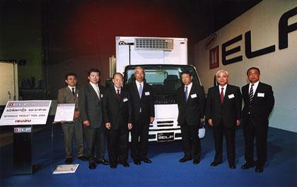 มร. อาร์. ซาคาตะ (ขวาสุด) กรรมการผู้จัดการ บริษัท ตรีเพชรอีซูซุเซลส์ จำกัด เป็นประธานงานเปิดตัว “อีซูซุเอลฟ์ รุ่นใหม่ ! เครื่องยนต์ใหม่ 175 แรงม้า ซูเปอร์คอมมอนเรล” ครั้งแรกในวงการรถบรรทุกเมืองไทย พร้อมรูปลักษณ์ภายนอกภายในใหม่หมด เท่… ประหยัดน้ำมันยกตระกูล โดยได้รับเกียรติจาก มร. วาย. อิดะ ประธานบริษัท อีซูซุมอเตอร์ ประเทศญี่ปุ่น และ มร. เอ็ม. มิยาโมโตะ รองประธาน (กลุ่มเครื่องจักรและยานยนต์) บริษัท มิตซูบิชิ คอร์ปอเรชั่น (ประเทศญี่ปุ่น) ร่วมเป็นประธาน ณ ศูนย์สินค้านานาชาติไบเทค