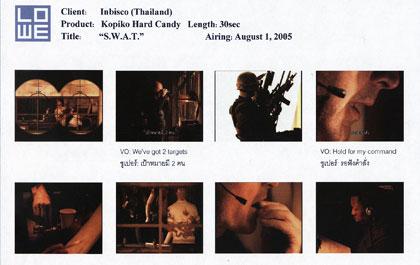 ลูกอมรสกาแฟตราโกปิโก้ – Kopiko โดยบริษัท อินบิสโก้ ประเทศไทย จำกัด – Inbisco (Thailand) ออกภาพยนตร์โฆษณาชุด “S.W.A.T” ผลิตโดยบริษัท สกายเอ็กซิทส์ จำกัด Sky Exits ภายใต้บริษัท โลว์ ลิมิเต็ด Lowe Limited ความยาว 30 วินาที แนวคิดคือ ความอร่อยของลูกอมโกปิโก้ ทำให้ลืมตัวไม่สามารถควบคุมตัวเองได้ ทั้งนี้เพื่อให้แบรนด์โกปิโก้เป็นแบรนด์อันดับแรกที่ผู้บริโภคนึกถึง และตอกย้ำว่าลูกอมโกปิโก้รสชาติกาแฟแท้ มุ่งกลุ่มวัยทำงานอายุ 20 ปีขึ้นไปที่ชื่นชอบกาแฟ โดย ภาพยนตร์โฆษณาชุดนี้ได้รับรางวัล “บรอนซ์” จากงาน AdMan Award ปี 2005 ในประเภท สินค้าขนมขบเคี้ยว