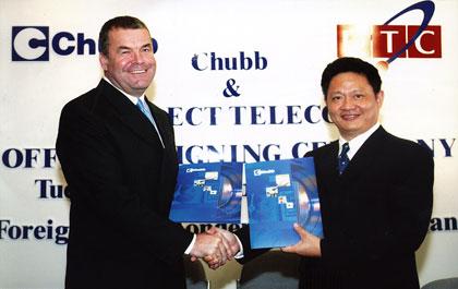 มิสเตอร์ เดวิด วิกก้าส์ (ซ้าย) กรรมการผู้จัดการบริษัท ชับบ์ ประเทศไทย ยักษ์ใหญ่ด้านการรักษาความปลอดภัยระดับโลก เซ็นสัญญาควบรวมกิจการกับ คุณสมภพ โปษะกฤษณะ กรรมการผู้จัดการ บริษัท ไดเร็คท์เทเลคอม ผู้นำด้านระบบรักษาความปลอดภัยอิเลคทรอนิกส์ชั้นแนวหน้าของไทย เปิด Chubb one stop shop ศูนย์บริการรักษาความปลอดภัยครบวงจรที่ใหญ่ที่สุดในประเทศไทยที่บางนา พร้อมผนึกทีมงานร่วมค้นคิดและพัฒนาเทคโนโลยีรักษาความปลอดภัยอิเลคทรอนิกส์ไฮเทคแนวใหม่ เพื่อสร้างระบบและอุปกรณ์รักษาความปลอดภัยสูงสุดให้บริษัทห้างร้าน สถานที่สาธารณะ และที่พักอาศัยทั้งประเทศโดยเฉพาะจุดเสี่ยงภัย