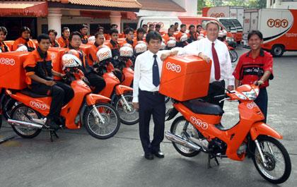 มร. เบรท เทอร์เนอร์ ผู้อำนวยการฝ่ายเอ็กซ์เพรส ศูนย์กระจายสินค้าและเส้นทางการขนส่ง ทีเอ็นที ประเทศไทย รับมอบมอเตอร์ไซด์โฉมใหม่ของทีเอ็นทีล็อตแรก จำนวน 30 คัน ซึ่งปัจจุบัน ทีเอ็นที ให้บริการจัดส่งพัสดุด่วนและไปรษณียภัณฑ์ทั้งในประเทศและต่างประเทศ พร้อมทั้งบริการลอจิสติกส์แบบครบวงจร โดยมียานพาหนะทั้งหมด 399 คัน และมีจำนวนพนักงาน 2,248 คน