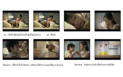 สืบเนื่องจากครอบครัวเดิม คราวนี้ลูกชายถึงเวลาต้องพักผ่อน คุณแม่จึงเล่านิทานเพื่อกล่อมนอน ขณะที่นิทานกำลังจะจบ และเด็กชายก็กำลังเคลิ้มหลับ ทันใดนั้น คุณแม่ก็ไอขึ้นมา เด็กชายที่กำลังจะหลับจึงสะดุ้งตื่นขึ้น และงัวเงียลุกขึ้นมา คุณแม่ได้แต่ส่ายหน้า เพราะคงต้องเริ่มเล่านิทานอีกรอบเพื่อที่จะกล่อมลูกน้อยให้หลับ คุณแม่จึงนึกถึงผลิตภัณฑ์ ที่จะนำมารับประทานเพื่อบรรเทาอาการไอ แต่ลูกน้อยด้วยความรักแม่ จึงช่วยป้อนยาให้คุณแม่บ้าง แสดงถึงความรักและห่วงใยซึ่งกันและกันในครอบครัว