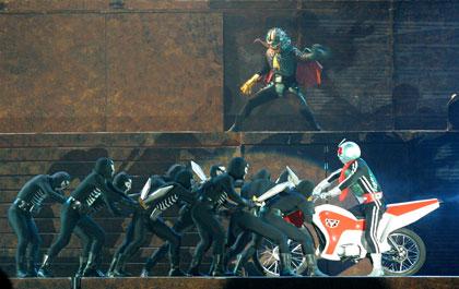 เมื่อเข้าสู่ช่วงที่ต้องต่อกรกับอสูรร้าย ผู้ชมทุกคนต่างตะลึงถึงฉากการต่อสู้ของบรรดาสมุนช็อคเกอร์และท่าไม้ตายของ “ไอ้มดแดง” พร้อมกันเป็นครั้งแรกบนเวทีเดียวกันในโชว์นี้เท่านั้น และศิลปะการต่อสู้ที่แสดงถึงพลังอันเข้มแข็ง ความคล่องแคล่วและเจนารมย์อันแรงกล้าในการปกป้องโลก ฝีมือการต่อสู้ที่ดุเดือดประกอบลีลาการขี่ ”เฮอริเคน” พาหนะคู่กายของ “ไอ้มดแดง V3” – “นิว ไซโคลน” พาหนะคู่กายของ “ไรเดอร์หมายเลข 1”
