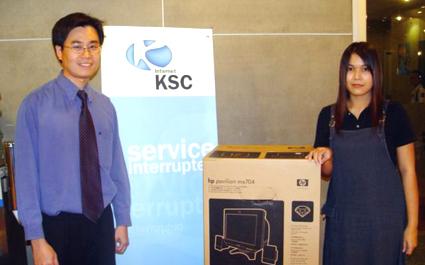 นายทวีศักดิ์ งามอมรภิรัตน์ (ซ้าย) ผู้จัดการอาวุโสฝ่าย Consumer Dial-up Development บริษัท เค เอส ซี คอมเมอร์เชียล อินเตอร์เนต จำกัด มอบรางวัลเครื่องคอมพิวเตอร์ตั้งโต๊ะ เอชพี พาวิลเลียน แก่ คุณสุรีรัตน์ กาญจนบริรักษ์ (ขวา) ลูกค้าอินเทอร์เน็ตแพ็คเกจของเค เอส ซี ที่มีการใช้งานสูงสุดประจำเดือนตุลาคม ในแคมเปญ “เซิร์ฟมาราธอน” ที่จัดขึ้นระหว่างเดือนตุลาคมถึงธันวาคมศกนี้ โดยลูกค้าที่ใช้งานอินเทอร์เน็ตสูงสุดในแต่ละเดือนจะได้รับรางวัลใหญ่ประจำเดือน และของที่ระลึกจาก เค เอส ซี รวม 20 รางวัลทุกเดือน และหากในช่วงโปรโมชั่น 3 เดือนนี้ มีการใช้งานอินเทอร์เน็ตรวมกันมากกว่า 100 ชั่วโมงต่อ 1 บัญชีอินเทอร์เน็ต ยังมีสิทธิ์ลุ้นรับพ็อกเกตพีซี เอชพี และของที่ระลึกจาก เค เอส ซี รวม 20 รางวัลอีกด้วย