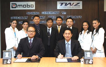 มร. โทนี่ ซี เอฟ ปัง (ซ้าย) กรรมการผู้จัดการ บริษัท ดีดับบลิว โมบาย (เอชเค) ลิมิตเตด (DW Mobile (HK) Limited) เซ็นสัญญากับนายพุทธชาติ รังคสิริ (ขวา) กรรมการผู้จัดการ บริษัท ทีดับบลิวแซด คอร์ปอเรชั่น จำกัด (มหาชน) (TWZ) แต่งตั้ง ทีดับบลิวแซดให้เป็นให้เป็นผู้จัดจำหน่ายโทรศัพท์เคลื่อนที่ Dmobo Disney Mobile Phone เพียงรายเดียวในประเทศไทย ซึ่ง Dmobo Disney Mobile Phone เป็นโทรศัพท์มือถือแฟชั่น สไตล์แฟนตาซีโฟนที่กำลังได้รับความนิยมอย่างสูงทั่วเอเชีย