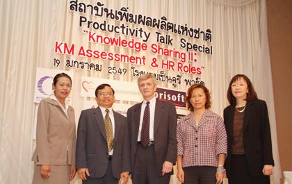 นายสังวร รัตนรักษ์ รองผู้อำนวยการสถาบันเพิ่มผลผลิตแห่งชาติ (คนที่ 2 จากซ้าย) เป็นประธานเปิดงานสัมมนา Productivity Talk Special หัวข้อ “Knowledge Sharing II : KM Assessment & HR Roles” เพื่อเผยแพร่ความรู้ด้านการบริหารจัดการความรู้ในองค์กรให้แก่ผู้ประกอบการทั้งภาครัฐและเอกชน พร้อมเสนองานวิจัยเรื่องวัฒนธรรมองค์กรที่เอื้อและเป็นอุปสรรคต่อการจัดการความรู้ในองค์กร โดยได้รับเกียรติจากวิทยากรผู้เชี่ยวชาญทั้งในและต่างประเทศ ได้แก่ Mr. Robert J. Osterhoff ที่ปรึกษาด้านการบริหารจัดการองค์กร บริษัท Xerox Corporation ดร.ยุวดี เกตุสัมพันธ์ ผู้ช่วยรองคณบดีฝ่ายพัฒนาคุณภาพงาน โรงพยาบาลศิริราช, ดร.เกศรา รักชาติ ผู้เชี่ยวชาญด้านองค์กรแห่งการเรียนรู้ และคุณรัชฏา อสิสนธิสกุล วิทยากรที่ปรึกษาส่วนบริหารงานบุคคล สถาบันเพิ่มผลผลิตแห่งชาติ ณ โรงแรมเซ็นจูรี่ ปาร์ค เมื่อเร็วๆ นี้