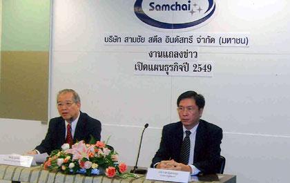 นายพัชวัฏ คุณชยางกูร รักษาการประธานกรรมการบริหาร (ซ้าย) และนายประวาส สันตวะกุล กรรมการผู้จัดการ (ขวา) บริษัท สามชัย สตีล อินดัสทรี จำกัด (มหาชน) ผู้ผลิตและจำหน่ายผลิตภัณฑ์ท่อเหล็กสำหรับงานอุตสาหกรรมก่อสร้างและอุตสาหกรรมเฟอร์นิเจอร์ แถลงข่าวเปิดกลยุทธ์แผนธุรกิจปี 2549 และภาพรวมการใช้ท่อเหล็กในโครงสร้างขนาดใหญ่ ซึ่งบริษัทฯสามารถเดินเครื่องจักรผลิตท่อเหล็กโครงสร้างขนาด 18 นิ้วได้เป็นรายแรกของไทย ณ บมจ. 124 คอมมิวนิเคชั่นส ดังนั้น ตั้งเป้ายอดขายรวมปี 2549 มูลค่า 7,000 ล้านบาท เมื่อเร็วๆ นี้