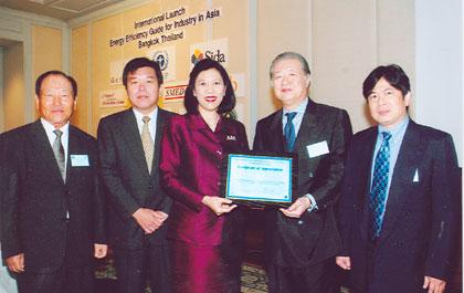 นางสาวสุจินดา โชติพานิชย์ (กลาง) รองปลัดกระทรวงวิทยาศาสตร์และเทคโนโลยี มอบรางวัลยกย่องให้บริษัท จี สตีล จำกัด (มหาชน) ผู้ผลิตเหล็กแผ่นรีดร้อนครบวงจรชั้นนำของไทย เป็นบริษัทที่มีการใช้พลังงานอย่างมีประสิทธิภาพสูงสุด จากการคัดเลือกโดยโครงการสิ่งแวดล้อมแห่งสหประชาชาติ โดยมีนายเรียวโซ โอกิโน (ที่ 2 จากขวา) รองประธานเจ้าหน้าที่บริหาร บริษัท จี สตีล จำกัด (มหาชน) เป็นตัวแทนเข้ารับรางวัลพร้อมด้วยผู้บริหารของทางบริษัท