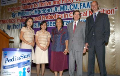 บริษัท แอ็บบอต ลาบอแรตอรีส จำกัด ผู้ผลิต “พีเดียชัวร์ คอมพลีต” อาหารสูตรครบถ้วนสำหรับเด็กอายุ 1 ถึง 10 ปี ที่เบื่ออาหารหรือกินยาก เชิญ ดร. วิลเลี่ยม ซี. แมคลีน ผู้เชี่ยวชาญด้านโภชนาการสำหรับเด็กจากสหรัฐอเมริกา มาให้ความรู้กับกุมารแพทย์ และพยาบาล เกี่ยวกับ “ภาวะโภชนาการของเด็กเบื่ออาหาร และกินยาก ส่งผลต่อพัฒนาการของเด็กอย่างไร” โดยมุ่งหวังให้คุณหมอนำความรู้จากการสัมมนาไปแนะนำคุณแม่ เพื่อส่งเสริมให้บุตรได้รับโภชนาการที่ดี สารอาหารครบถ้วน อันจะส่งผลให้มีพัฒนาการเติบโตสมวัย โดยมี นายสตีเฟน สตาร์ (ขวา) ผู้จัดการทั่วไป บริษัท แอ็บบอตฯ ให้การต้อนรับ ณ ห้องบอลรูม โรงแรม แชงกรีล่า เมื่อเร็วๆนี้