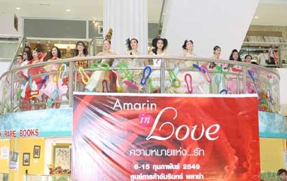 งาน “Amarin In Love” จัดขึ้นเป็นเวลา 10 วันเต็ม โดยเริ่มตั้งแต่วันอังจันทร์ที่ 6 กุมภาพันธ์ ไปจนถึงวันพุธที่ 15 กุมภาพันธ์2549 ณ อัมรินทร์ ฮอลล์ ศูนย์การค้าอัมรินทร์ (สี่แยกราชประสงค์) ภายในพื้นที่กว่า 400 ตารางเมตร พรั่งพร้อมไปด้วยบริการเกี่ยวกับงานมงคลสมรสครบถ้วน ไม่ว่าจะเป็นร้านสตูดิโอถ่ายภาพ แพ็กเกจจัดเลี้ยงงานวิวาห์ การจำหน่ายแพ็คเกจฮันนีมูนของโรงแรมและรีสอร์ทชื่อดัง บริการตรวจสุขภาพก่อนวิวาห์ บริการให้คำปรึกษาเรื่องชีวิตสมรส ไปจนถึงการตรวจ ”ดวงชะตา ราหูคู่รัก” โดยทีมโหรห้าดาวส์ นำทีมโดย “เจ๋ง เจได” ซึ่งถือโอกาสมาเปิดตัวในงานนี้เป็นครั้งแรกอีกด้วย สนใจสอบถามข้อมูลเพิ่มเติมได้ที่ โทร. 0 2256 9111 ต่อ 204