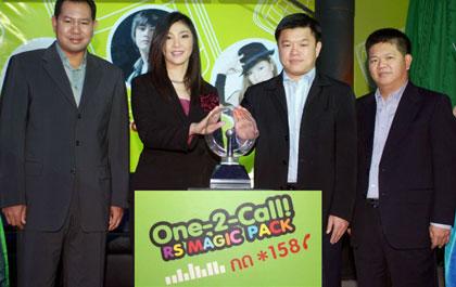 นางสาวยิ่งลักษณ์ ชินวัตร กรรมการผู้อำนวยการ เอไอเอส และนายสุรชัย เชษฐโชติศักดิ์ ประธานเจ้าหน้าที่บริหารและกรรมการผู้จัดการ อาร์เอส ร่วมกันเปิดตัว “วัน-ทู-คอล! อาร์เอส เมจิก แพ็ค” ศูนย์รวมความบันเทิงบนโทรศัพท์มือถือ เอาใจลูกค้าเอไอเอสให้ได้รับความสนุกสนานและความบันเทิงทุกที่ ทุกเวลา ด้วยวิธีการง่ายๆ เพียงกด *158 ตั้งแต่วันที่ 7 มีนาคมนี้เป็นต้นไป สอบถามรายละเอียดเพิ่มเติมได้ที่ เอไอเอส คอลล์ เซ็นเตอร์ 1175