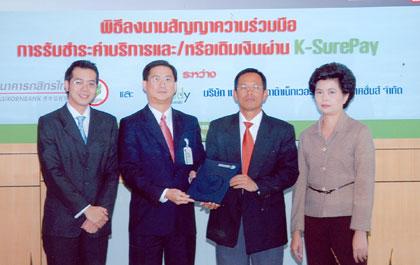 นายชาติชาย สุนทรเกียรติ ผู้ช่วยกรรมการผู้จัดการ ธนาคารกสิกรไทย และนายตรัยรัตน์ แก้วเกิด กรรมการผู้จัดการ บริษัท แอดวานซ์ ดาต้าเน็ทเวอร์ค คอมมิวนิเคชั่นส์ จำกัด ลงนามในความร่วมมือการให้บริการ K-SurePay ในการรับชำระและเติมเงินค่าบริการอินเทอร์เน็ตความเร็วสูง อินเตอร์แอคทีฟทีวี และวิดีโอออนดีมานด์ แก่สมาชิก Buddy Broadband ผ่านช่องทางอิเล็กทรอนิกส์ แบงกิ้งของธนาคาร ณ ธนาคารกสิกรไทย สำนักงานใหญ่ เมื่อเร็วๆ นี้