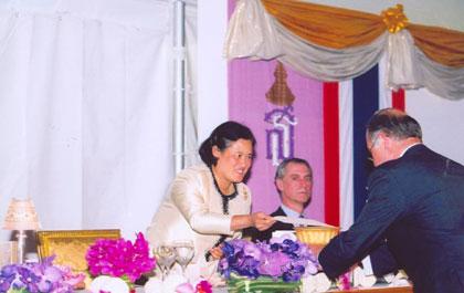 บรรยายภาพ (จากซ้าย) สมเด็จพระเทพรัตนราชสุดาฯ สยามบรมราชกุมารี ทรงรับเช็คมูลค้า 10 ล้านบาทที่ บริษัท ดีทแฮล์ม จำกัด ได้บริจาคให้กับมูลนิธิอานันทมหิดลจากมร.แอนเดรียส์ ดับเบิลยู เคเลอร์ ประธานคณะบริหารบริษัท ดีทแฮล์ม โฮลดิ้ง จำกัด โดยมีมร.เอเดรียน ที เคลเลอร์ (กลาง) ร่วมเป็นสักขีพยาน