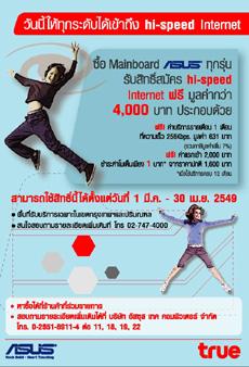 ทรูร่วมกับอัสซุส ขยายการเข้าถึงไฮสปีดอินเทอร์เน็ตสู่ลูกค้าทุกระดับ เปิดแคมเปญใหม่ วันโฮม วันพีซี ( One Home One PC ) เอาใจลูกค้าระดับรากหญ้า ทันทีที่ซื้อเมนบอร์ดจากอัสซุสทุกรุ่น รับสิทธิพิเศษสุดคุ้มถึง 2 ต่อ ทั้งบัตรกำนัลอินเทอร์เน็ตความเร็วสูงจากทรูใช้แทนค่าบริการรายเดือนอินเทอร์เน็ตความเร็ว 256 Kbps พร้อมมอบสิทธิพิเศษฟรีค่าแรกเข้ามูลค่า 2,000 บาท และรับโมเด็มมูลค่า 1,600 บาท ได้ในราคาเพียง 1 บาท มุ่งขยายกลุ่มผู้ใช้บริการอินเทอร์เน็ตความเร็วสูง ปูทางไปสู่ความเท่าเทียมกันของชีวิตทุกระดับชั้น เพื่อเสริมสร้างสังคมแห่งการเรียนรู้และภูมิปัญญาให้กับประเทศไทย