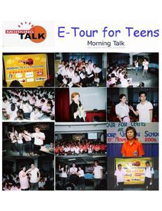 ดร. วาเลอรี่ แมคเค็นซี่ เจ้าของและพิธีกรนำรายการ “มอร์นิ่ง ทอล์ค” ที่นำคณะไปจัดกิจกรรม “E-Tour for Teens” ครั้งนี้ เปิดเผยว่า “ในการจัดกิจกรรม “E-Tour for Teens” เราจะหมุนเวียนไปตามโรงเรียนต่าง ๆ ทั้งในเขตกรุงเทพฯ และต่างจังหวัด โดยเราจะทำงานร่วมกับกระทรวงศึกษาธิการในการคัดเลือกโรงเรียนที่เข้าร่วมโครงการ English Programme หรือ Mini English Programme การจัดกิจกรรมแต่ละครั้งเราเน้นเรื่องสาระและความบันเทิงพร้อมกันไป โดยกิจกรรมจะเป็นภาษาอังกฤษทั้งหมด เพื่อให้เกิดการเรียนรู้กับเจ้าของภาษา รวมทั้งยังช่วยส่งเสริมความเชื่อมั่นในการใช้ภาษาอังกฤษจากทีมงานของเรา ที่ถึงแม้จะไม่มีโอกาสไปศึกษาต่อในต่างประเทศแต่ก็สามารถใช้ภาษาอังกฤษในการสื่อสารได้เป็นอย่างดี ทำให้เยาวชนเกิดความมั่นใจว่าจริง ๆ แล้วภาษาอังกฤษไม่ยากเกินไป”