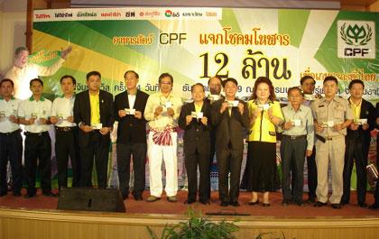 บริษัท เจริญโภคภัณฑ์อาหารสัตว์ (มหาชน) จำกัด หรือ CPF ผู้ดำเนินธุรกิจการผลิตและจัดจำหน่ายอาหารสัตว์รายใหญ่ของประเทศไทย จัดโครงการ “อาหารสัตว์ซีพีเอฟแจกโชคมโหฬาร 12 ล้าน เพื่อเกษตรกรทั่วไทย” ได้มีการจับรางวัลครั้งสุดท้ายที่ปทุมธานี โดยมีคุณวีรชัย รัตนบานชื่น รองกรรมการผู้จัดการ บริษัท เจริญโภคภัณฑ์อาหาร จำกัด (มหาชน) (ที่ 5 จากซ้าย) เป็นประธานในพิธี ร่วมด้วยคุณเรวัติ หทัยสัตยพงศ์ รองกรรมการผู้จัดการอาวุโส (แถวหน้า ที่ 3 จากขวา) และแขกรับเชิญกิตติมศักดิ์ให้เกียรติร่วมเป็นสักขีพยาน