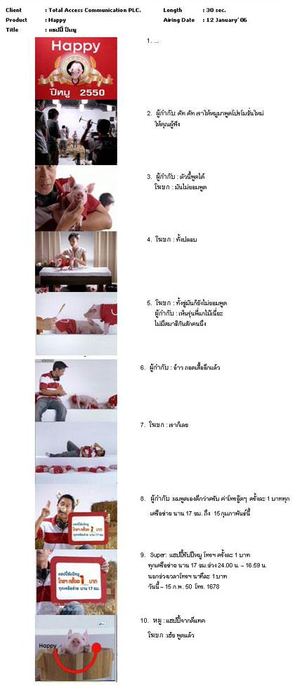 เนื่องจากปีนี้เป็นปีหมู “แฮปปี้” > จึงให้หมูมาสวัสดีปีใหม่และมอบของขวัญสุดพิเศษให้กับลูกค้า โดยหลังจากผู้กำกับหนังโฆษณาได้พยายามทุกวิถีทางให้หมูออกมาพูดโฆษณาโปรโมชั่นใหม่ของแฮปปี้ให้ได้ ทั้งปลอบด้วยบริการนวดแบบสปาแสนสบาย หรือขู่ด้วยการนำรุ่นพี่ (หมูสะเต๊ะ) มาให้ดูเป็นตัวอย่าง และอีกสารพัดวิธี แต่ทำอย่างไรหมูก็ไม่ยอมพูด