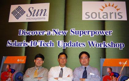ดร. ธนชาติ นุ่มนนท์ (กลาง) ผู้อำนวยการฝ่ายพัฒนาธุรกิจ ซัน ไมโครซิสเต็มส์ (ประเทศไทย) นำทีมวิศวกรผู้เชี่ยวชาญจากซัน ไมโครซิสเต็มส์ ให้ข้อมูลอัพเดทล่าสุดของระบบปฏิบัติการ Solaris 10 พร้อมเจาะลึกคุณสมบัติการใช้งานใหม่ๆ และสาธิตวิธีการใช้งานแบบต่างๆ อาทิ Dtrace, SSO, RBAC เพื่อประสิทธิภาพสูงสุดในการใช้งานระดับเอ็นเทอร์ไพร์ส แก่บรรดานักเทคนิกด้านไอที และไอทีแมเนเจอร์ ในงาน Solaris 10 Tech Updates Workshop ณ ห้องแกรนด์บอลลูม 3 โรงแรมแกรนด์ไฮแอท เอราวัณ เมื่อเร็วๆ นี้