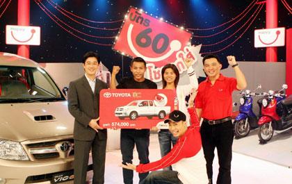 ทั้งนี้ แคมเปญ “บัตร 60 โชคหกใส่” เป็นการโปรโมตสินค้าและบริการของพันธมิตรบนบัตรเติมเงินเป็นครั้งแรก โดยที่พิมพ์รูปรถกระบะโตโยต้า ไฮลักซ์ วีโก้ รถจักรยานยนต์ยามาฮ่า FINO และโทรศัพท์มือถือโมโตโรล่า MOTORAZR V3i บนหน้าบัตร ลูกค้าที่มีความต้องการจะร่วมสนุกลุ้นรับของรางวัลประเภทใดก็สามารถตัดชิ้นส่วนจากบัตรเติมเงินแบบนั้น ๆ เพื่อส่งเข้าร่วมชิงโชคเป็นเจ้าของโตโยต้าไฮลักซ์ วีโก้ 5 คัน มูลค่าคันละ 574,000 บาท มอเตอร์ไซค์ยามาฮ่า FINO 60 คันมูลค่าคันละ 41,000 บาท และโทรศัพท์มือถือโมโตโรล่า MOTORAZR V3i จำนวน 100 เครื่อง มูลค่าเครื่องละ 11,500 บาท รวมของรางวัลมูลค่าทั้งสิ้น 6,480,000 บาท ผู้โชคดีสามารถตรวจสอบรายชื่อได้จากเวบ www.happy.co.th