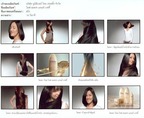 ภาพยนตร์โฆษณาจะสื่อให้เห็นถึงคุณสมบัติของสินค้าที่ช่วยทำให้ผมตรงสวยและมีน้ำหนัก โดยการนำเสนอผ่านภาพจริงของหญิงหลากหลายเชื้อชาติทั้งยุโรปและเอเชีย ที่มีสภาพเส้นผมแตกต่างกัน กำลังสะบัดผมไปมา เห็นความพลิ้วไหวของเส้นผมที่กลับเรียงเส้นสวยอย่างเป็นธรรมชาติหลังจากสะบัด และสีหน้าแสดงออกถึงความพึงพอใจของผู้ที่เป็นเจ้าของผมสวยสมบูรณ์แบบ ในตอนท้ายจึงถามคุณกลับว่า ผมคุณพลิ้วไหวกลับคืนทรงสวยอย่างภาพที่เห็นได้หรือเปล่า พร้อมกลับแนะนำผลิตภัณฑ์ใหม่
