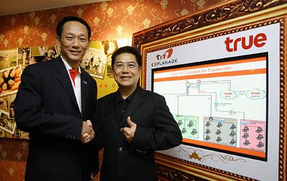 เอสพละนาด รัชดา โดย นายสมคิด ตันทัดวาณิชย์กุล (ขวา) ประธานเจ้าหน้าที่บริหาร บริษัท สยามฟิวเจอร์พร็อบเพอร์ตี้ จำกัด จับมือกับ ทรู โดยนายทรงธรรม เพียรพัฒนาวิทย์ (ซ้าย) ผู้อำนวยการบริหาร ด้าน Corporate Solutions, Wholesales & Data บริษัท ทรู คอร์ปอเรชั่น จำกัด (มหาชน) ในโอกาสที่ทรูได้รับมอบหมายให้เป็นผู้ดำเนินการติดตั้งและให้บริการไอซีที โซลูชัน ครบวงจร ด้วยเทคโนโลยี Leased line, MPLS, ADSL และ DDN รองรับการใช้งานโทรศัพท์พื้นฐาน ไอพีโฟน (IP Telephony) โทรศัพท์เคลื่อนที่ โทรศัพท์สาธารณะ และอินเทอร์เน็ตไร้สายความเร็วสูง (Wi-Fi) เพื่อเพิ่มศักยภาพในการบริหารงาน และเพิ่มประสิทธิภาพในการให้บริการลูกค้าภายในศูนย์บันเทิงเชิงศิลป์ เอสพละนาด รัชดา