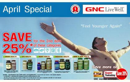 ศูนย์รวมผลิตภัณฑ์เสริมอาหาร GNC (General Nutrition Centers) จากสหรัฐอเมริกา สนับสนุนให้ทุกครอบครัวมีสุขภาพดีรับวันครอบครัวโดยเฉพาะท่านผู้หลักผู้ใหญ่ที่เป็นเสมือนร่มโพธิ์ ร่มไทรของเรา โดยตั้งแต่วันนี้ – 30 เมษายน 2550 รับส่วนลด 25% เมื่อซื้อผลิตภัณฑ์เสริมอาหาร GNC ในชิ้นที่ 2 สำหรับกลุ่มบำรุงสมอง, ดวงตา, หัวใจ, ระบบย่อยอาหาร, กระดูกและข้อต่อ เช่น บิลเบอร์รี่, จิงโกไบโลบา (แปะก๊วย), แคลเซียม, อัลฟัลฟา, โคเอมไซม์ คิว-10 เป็นต้น และเมื่อซื้อครบทุก 1,000 บาท รับฟรี! ตลับยา GNC Red Pill Box มูลค่า 45 บาท
