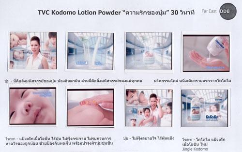ความน่ารักของสองพรีเซ็นเตอร์โดยเฉพาะ พรีเซ็นเตอร์ตัวน้อย ได้ทำให้การถ่ายทำผ่านไปได้อย่างไม่ยากเย็น ที่สำคัญคือสามารถสื่อถึงสิ่งมหัศจรรย์ใหม่สำหรับแม่ทุกคนนั่นคือ โคโดโมแป้งเด็กเนื้อโลชั่น ที่ “ไม่ฟุ้ง สบายใจ ไร้ฝุ่นแป้ง” ได้ตรงเป้าวัตถุประสงค์การสื่อสารที่ต้องการสื่อทุกประการ