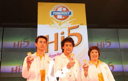 เมื่อเร็วๆ นี้ คุณกวีมาศ ตั้งคีรีพิมาน ผู้อำนวยการฝ่ายการตลาด บริษัท ฟรีสแลนด์ ฟู้ดส์ โฟร์โมสต์ (ประเทศไทย) จำกัด (มหาชน) (ขวามือ) พร้อมด้วยคุณวิภาส ปวโรจน์กิจ ผู้อำนวยการฝ่ายขาย (ซ้ายมือ) เปิดตัวผลิตภัณฑ์ใหม่ “นมถั่วเหลืองโฟร์โมสต์ ไฮไฟว์ ผสมน้ำแครอท และเบอร์รีสกัด” พร้อมกันนี้ โฟร์โมสต์ ไฮไฟว์ยังได้เปิดตัว “บี้ เดอะสตาร์” หรือ สุกฤษฎิ์ วิเศษแก้ว นักร้องชื่อดัง เป็นพรีเซนเตอร์หลักของผลิตภัณฑ์ด้วย