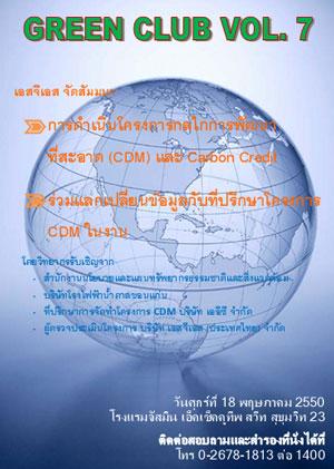 บริษัท เอสจีเอส (ประเทศไทย) จำกัด จัดงานสัมมนา Green Club ครั้งที่ 7 ขึ้น ว่าด้วยเรื่องของการดำเนินโครงการกลไกการพัฒนาที่สะอาด (CDM) และ Carbon Credit โดยได้รับเกียรติจากวิทยากรผู้ทรงคุณวุฒิจาก สำนักงานนโยบายและแผนทรัพยากรธรรมชาติและสิ่งแวดล้อม, บริษัทโรงไฟฟ้าน้ำตาลขอนแก่น, ที่ปรึกษาการจัดทำโครงการ CDM บริษัท เออีซี จำกัด และผู้ตรวจประเมินโครงการ บริษัท เอสจีเอส (ประเทศไทย) จำกัด