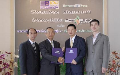 นายพิชญา พุทธารี กรรมการผู้จัดการ บริษัท ธารารมณ์เอสเตท จำกัด (ที่ 2 จากขวา) และนายอลัน หลิน ประธานเจ้าหน้าที่บริหาร บริษัท ฮาริสัน จำกัด (มหาชน) ถ่ายภาพเป็นที่ระลึก ร่วมกับนายกฤษณ์ อรรถกฤษณ์ ผู้ช่วยผู้จัดการใหญ่ สายการตลาดธุรกิจขนาดใหญ่ 2 และนายสมหมาย อึ้งศรีทอง ผู้จัดการธุรกิจ ธนาคารไทยพาณิชย์ ในพิธีลงนาม สัญญาสนับสนุนการเงินให้แก่ โครงการ เดอะลิงค์ คอนโดมิเนียมกลางใจเมือง เมื่อเร็วๆ นี้