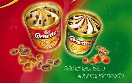 ไอศกรีม “คอร์นเนตโต โกลด์ คัพ” รสเฮเซลนัท มอคค่า ฟัดจ์ และคาเฟ่ คาราเมลโล มีจัดจำหน่ายตามไฮเปอร์มาร์เก็ต ซูเปอร์มาร์เก็ต ร้านสะดวกซื้อทั่วไปและร้านสะดวกซื้อในสถานีบริการน้ำมัน ในราคาถ้วยละ 25 บาท