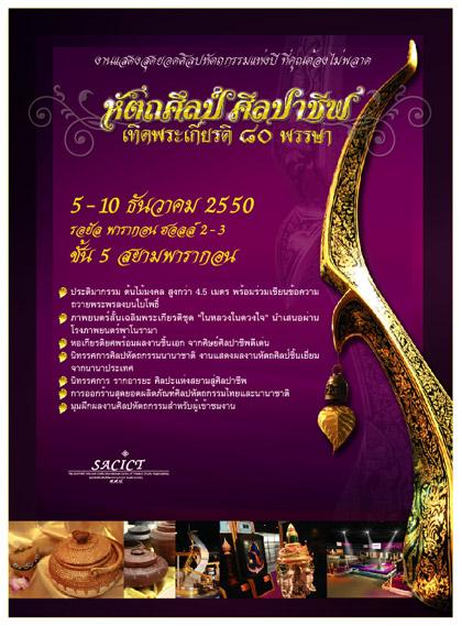 ศูนย์ส่งเสริมศิลปาชีพระหว่างประเทศ (องค์กรมหาชน) หรือ ศ.ศ.ป. ขอเชิญชวนชมงาน “หัตถศิลป์ ศิลปาชีพ เทิดพระเกียรติ 80 พรรษา พระบาทสมเด็จพระเจ้าอยู่หัว” เนื่องในวโรกาสที่พระบาทสมเด็จพระเจ้าอยู่หัวเฉลิมพระชนมพรรษา 80 พรรษา และเพื่อเป็นการเทิดพระเกียรติที่ทรงให้ความสำคัญต่องานศิลปาชีพ