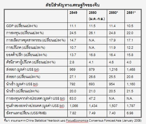แม้เศรษฐกิจจีนในปี 2551 อาจเติบโตในอัตราชะลอตัวลงเล็กน้อยจากปี 2550 แต่คาดว่ายังคงเติบโตในอัตราสูงที่ร้อยละ 10.5 การเติบโตทางเศรษฐกิจของจีนในปี 2551 จะให้น้ำหนักกับการบริโภคในประเทศที่สูงขึ้น ขณะเดียวกันค่าเงินหยวนก็คาดว่าจะแข็งค่าขึ้นราวร้อยละ 6 ซึ่งน่าจะทำให้การนำเข้าของจีนเพิ่มขึ้นมากกว่าในปี 2550 ไทยจึงน่าจะได้ประโยชน์จากการส่งออกไปจีน โดยคาดว่ายอดส่งออกของไทยน่าจะเพิ่มขึ้นไม่น้อยกว่าร้อยละ 20 โดยสินค้าอุปโภคบริโภคและสินค้าอุตสาหกรรมน่าจะขยายตัวได้ดี ส่วนการนำเข้าของไทยจากจีนน่าจะเพิ่มขึ้นมากกว่าร้อยละ 20 เนื่องจากการนำเข้าสินค้าทุน วัตถุดิบอุตสาหกรรมและสินค้าอุปโภคบริโภคของไทยจะเพิ่มขึ้นตามแนวโน้มการบริโภคและการลงทุนที่จะขยายตัวสูงขึ้นในปี 2551