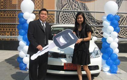 คุณชาญ เธียรกาญจนวงศ์ กรรมการผู้จัดการ บริษัทบิ๊ก คาเมร่า จำกัด เป็นผู้แทนมอบรถยนต์นิสสัน ทีด้า คันสุดท้าย จากทั้งหมด 3 คัน มูลค่ากว่า 700,000 บาท แก่คุณนฤมล นภามาศ ผู้โชคดีจากการส่งคูปองเข้าร่วมชิงรางวัลจากแคมเปญ Big Camera … Big Bonus ฉลอง 100 สาขาศูนย์จำหน่ายกล้องดิจิตอลบิ๊กคาเมร่า ณ ลานหน้าเซ็นทรัล เวิล์ด เมื่อวันก่อน
