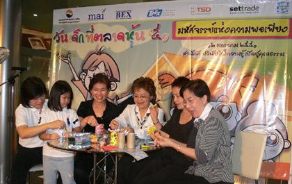 ภัทรียา เบญจพลชัย กรรมการและผู้จัดการ ตลาดหลักทรัพย์ฯ (กลาง) พร้อมด้วย (จากซ้าย) เกศรา มัญชุศรี กรรมการผู้จัดการ บมจ. ตลาดอนุพันธ์ (ประเทศไทย) โสภาวดี เลิศมนัสชัย กรรมการผู้จัดการ บจ. ศูนย์รับฝากหลักทรัพย์ (ประเทศไทย) จิราพร คูสุวรรณ ผู้อำนวยการบริหาร สถาบันพัฒนาความรู้ตลาดทุน และ ดร.นารี บุญธีรวร ผู้ช่วยผู้จัดการ สายงานบริหารตลาดหลักทรัพย์ฯ ประดิษฐ์กระถางสวนครัวแสนรักและถ้วยใส่ปากกา ดินสอ ซึ่งประดิษฐ์จากแกนกระดาษทิชชู่ มอบให้เด็ก ๆ ที่มาร่วมงานวันเด็กที่ตลาดหุ้น 2551 ณ อาคารตลาดหลักทรัพย์ฯ