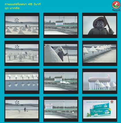 เรื่องราว เหตุการณ์ทั้งหมดเกิดขึ้นที่นาเกลือแห่งหนึ่งที่จังหวัดสมุทรสาคร ในขณะที่สาวนาเกลือกำลังกวาดเกลือมากองรวมกัน ทันใดนั้นรถยาสีฟันสมุนไพรดอกบัวคู่ ซึ่งมาในรูปแบบแปรงสีฟันก็วิ่งเข้ามาที่นาเกลือเพื่อมารับเกลือบริสุทธิ์ที่กองเรียงแถวกันอยู่ พอรู้ว่ารถของยาสีฟันสมุนไพรดอกบัวคู่มารับ ทั้งหมดต่างก็ลุกกระโดดโลดเต้นบัลเลต์ด้วยความดีใจที่ในที่สุดก็ได้ไปทำงานกับยาสีฟันสมุนไพรดอกบัวคู่เสียทีเพราะเกลือบริสุทธิ์รู้ดีว่าทำงานที่นี้ตัวเองจะได้แสดงความสามารถในการดูแลเหงือกและฟันร่วมกับสมุนไพรธรรมชาติได้อย่างเต็มที่