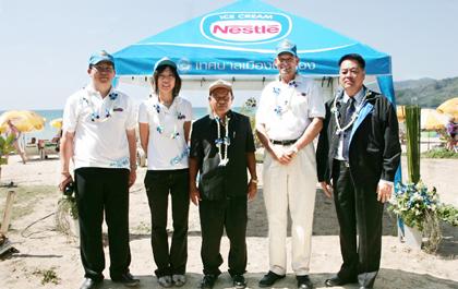 มร. เคน โดนัลด์สัน ผู้อำนวยการบริหาร ธุรกิจไอศกรีม บริษัท เนสท์เล่ (ไทย) จำกัด (ที่สองจากขวา) มอบเต็นท์ชายหาดจำนวน 70 หลัง ให้กับเทศบาลเมืองป่าตอง โดยมี นายวรนาถ ทองย่น รองนายกเทศมนตรีเทศบาลเมืองป่าตอง (กลาง) เป็นตัวแทนรับมอบ ซึ่งโครงการนี้นับเป็นหนึ่งในความร่วมมือระหว่างเนสท์เล่ (ไทย) และเทศบาลเมืองป่าตองกับผู้ประกอบการร้านค้าริมชายหาดในการจัดระเบียบแหล่งท่องเที่ยวที่มีชื่อเสียงของประเทศ ณ ลานโลมาหาดป่าตอง จ.ภูเก็ต
