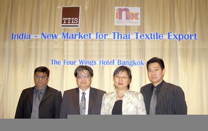 บริษัท ทีทีไอเอส จำกัด ผู้ผลิตสื่อสิ่งพิมพ์ TTIS Textile Digest, TTIS FashionBiz และ Logistics Digest จัดสัมมนา “แนวทางการเจาะตลาดสิ่งทอและเครื่องนุ่งห่มในประเทศอินเดีย” เพื่อให้ข้อมูลการค้าสิ่งทอและเครื่องนุ่งห่มในประเทศอินเดีย พร้อมแนะแนวทางการทำตลาดในอินเดีย โดยมี (จากซ้ายไปขวา) Mr. Rajesh Bhagat บรรณาธิการผู้พิมพ์โฆษณาและบรรณาธิการบริหารนิตยสาร International Textile India คุณพิทยา บุญยิ่ง ผู้อำนวยการกองกลุ่มงานอินเดียและเอเชียใต้ สำนักพัฒนาการตลาดต่างประเทศ กรมส่งเสริมการส่งออก ดร. รจนา โกศัยยานนท์ กรรมการผู้จัดการ บริษัท ทีทีไอเอส จำกัด และ คุณธิติวัฒน์ ธีรกุลธัญโรจน์ หัวหน้าส่วนศึกษาและพัฒนาระบบส่งเสริม SMEs 2 ฝ่ายพัฒนาระบบส่งเสริม SMEs ร่วมบรรยาย โดยมีผู้ประกอบการสิ่งทอและเครื่องนุ่งห่มของไทยเข้าร่วมรับฟังการบรรยายกว่า 100 ราย