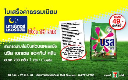 เคาน์เตอร์เซอร์วิสขอแนะนำโปรโมชั่นใหม่ “ซักสะอาด…ปราศจากยอดค้างชำระ” สำหรับลูกค้าที่ชำระค่าน้ำ ค่าไฟฟ้า และค่าภาษีอากรเฉพาะที่ยืนแบบผ่านทางอินเตอร์เน็ต เพียงนำใบเสร็จค่าธรรมเนียมมาเป๋นส่วนลด 10 บาท ในการแลกซื้อ บรีสเอกเซล แอคทีฟ คลีน ขนาด 700 กรัม 1 ถุง ต่อ 1 ใบเสร็จค่าธรรมเนียม จากราคาปกติ 59 บาท ลดเหลือ 49 บาท เฉพาะที่ร้าน 7-11 เท่านั้น เริ่มตั้งแต่วันที่ 26 กุมภาพันธ์ 2551 – วันที่ 25 มีนาคม 2551