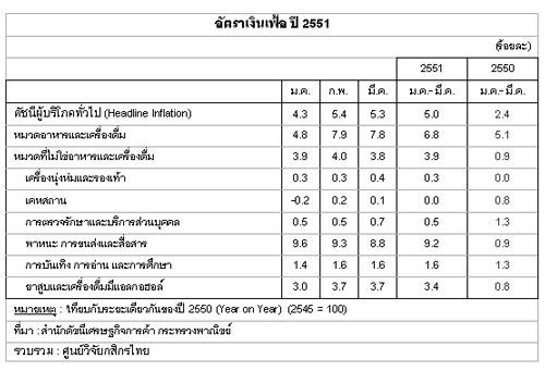 โดยอัตราเงินเฟ้อทั่วไปในช่วงไตรมาสแรกของปี 2551(ม.ค.-มี.ค.) ได้เพิ่มสูงขึ้นถึงร้อยละ 5.0 เปรียบเทียบกับไตรมาสแรกของปี 2550 ที่เพิ่มขึ้นเพียงร้อยละ 2.4 เท่านั้น โดยเฉพาะอย่างยิ่งดัชนีราคาสินค้าหมวดอาหารและเครื่องดื่มที่จำเป็นต่อการดำรงชีวิตประจำวันในช่วงไตรมาสแรกของปี 2551 ได้ปรับตัวเพิ่มขึ้นสูงถึงร้อยละ 6.8 เปรียบเทียบกับช่วงระยะเดียวกับปีก่อนที่เพิ่มขึ้นร้อยละ 5.1