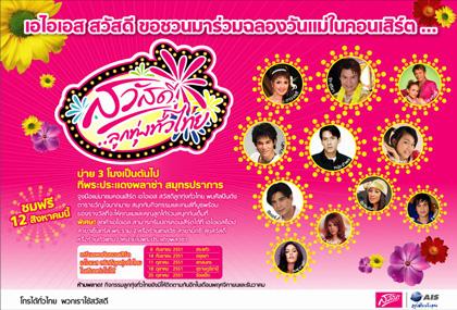 ต้อนรับ “วันแม่” ไปสนุกแบบฟรีๆ ด้วยกันทั้งแม่ลูกกับ “เฉลิมพระเกียรติ 12 สิงหามหาราชินี คอนเสิร์ต เอไอเอส สวัสดี ลูกทุ่งทั่วไทย” เตรียมรับความมันส์จากขาร็อก หนุ่ย-อำพล ลำพูน และนักร้องลูกทุ่ง อาทิ ดาว-มยุรี, รุ่ง-สุริยา, โจนัส และ คริตตี้ ฯลฯ ในวันอังคารที่ 12 สิงหาคม 2551 ตั้งแต่เวลา 15.00 น. เป็นต้นไป ที่พระประแดงพลาซ่า จังหวัดสมุทรปราการ