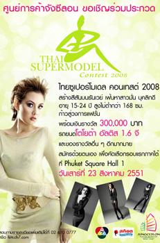 ศูนย์การค้าจังซีลอน ป่าตอง ภูเก็ต ร่วมกับสถานีโทรทัศน์สีกองทัพบกช่อง 7 และสก็อต ขอเชิญชวนสาวๆ สมัครเข้าร่วมประกวดในรอบคัดเลือกภาคใต้ “Thai Super Model Contest 2008” เวทีสำหรับสาวที่มีความมั่นใจ บุคลิกดี อายุระหว่าง 15-24 ปี ส่วนสูงไม่ต่ำกว่า 168 ซม. เพื่อก้าวเข้าสู่การเป็นดาวดวงใหม่ในวงการแฟชั่นเมืองไทย พร้อมชิงเงินรางวัลรวมมูลค่ากว่า 300,000 บาท รถยนต์โตโยต้า อัลติส และของรางวัลอื่นๆอีกมากมาย