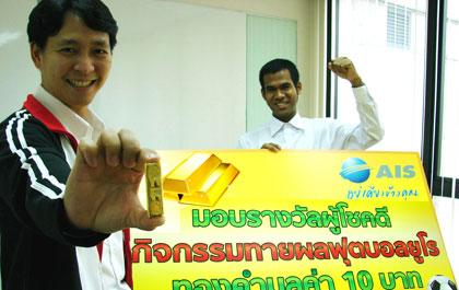 นายปรัธนา ลีลพนัง ผู้อำนวยการสำนักบริการเสริม เอไอเอส ร่วมกับบริษัทสามารถ มัลติมีเดีย จำกัด มอบรางวัลทองคำหนัก 10 บาท มูลค่า 150,000 บาท ให้กับนายตอเฮ เจาะแฮ ลูกค้าเอไอเอส ผู้โชคดีที่ร่วมสนุกกับกิจกรรมทายผลฟุตบอลยูโร ส่ง SMS เชียร์ทีมโปรด ลุ้นทีมชาติสเปนให้เป็นแชมป์เจ้ายุโรปสำเร็จ