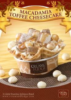 เดอะ ครีม แอนด์ ฟัดจ์ แฟคตอรี่ ชวนคุณมาลิ้มลองเมนูสูตรพิเศษจากแดนไกล กับ แมคคาเดเมีย ท๊อฟฟี่ ชีสเค้ก โดดเด่นด้วยรสชาติกรุบกรอบจากถั่วแมคคาเดเมียเลื่องชื่อ จากออสเตรเลีย และเพลิดเพลินไปกับความหวานหอมมันของไอศกรีมคาราเมลและไอศกรีมชีสเค้กที่คลุกเคล้ากันได้อย่างลงตัว พร้อมเพิ่มความหวานมันด้วยซอสคาราเมลและเวเฟอร์ฮาเซลนัทแสนอร่อย