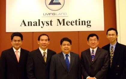 นายวันชัย ศุภพยัคฆ์ (ที่ 2 จากซ้าย) ประธานเจ้าหน้าที่บริหาร และนายภัทรลาภ ทวีวงศ์ ณ อยุธยา (ริมซ้าย) กรรมการผู้จัดการ บริษัท ลิฟวิ่งแลนด์ แคปปิตอล จำกัด (มหาชน) (LL) นำทีมคณะผู้บริหารบริษัทฯ ให้ข้อมูลนักวิเคราะห์หลักทรัพย์ ในโอกาสที่หุ้นของบริษัทฯ เข้าซื้อขายในตลาดหลักทรัพย์แห่งประเทศไทย ในกลุ่มอสังหาริมทรัพย์และก่อสร้าง หมวดธุรกิจพัฒนาอสังหาริมทรัพย์ ตั้งแต่วันที่ 1 สิงหาคม 2551 เป็นต้นไป ณ ห้องมณฑาทิพย์ 4 โรงแรมโฟร์ ซีซั่น กรุงเทพ เมื่อเร็วๆ นี้
