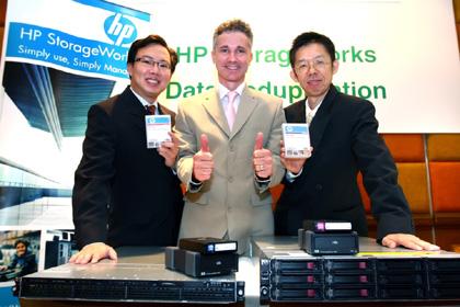 จากภาพ :บรรยายภาพ 1 (จากซ้าย-ขวา) – จากภาพ :มร. ฮัมฟรีย์ ซี ผู้จัดการหน่วยธุรกิจ StorageWorks กลุ่มธุรกิจ เทคโนโลยี โซลูชั่นส์ กรุ๊ป บริษัท ฮิวเลตต์-แพคการ์ด ประจำภูมิภาคเอเชียตะวันออกเฉียงใต้, มร. แอนดรู ดิกเคอร์สัน ผู้จัดการการตลาดผลิตภัณฑ์ หน่วยธุรกิจ Storage Platforms เอชพีสำนักงานใหญ่ และคุณวีระ ตั้งติยะพันธ์ ผู้จัดการธุรกิจ หน่วยธุรกิจ StorageWorks กลุ่มธุรกิจ เทคโนโลยี โซลูชั่นส์ กรุ๊ป บริษัท ฮิวเลตต์-แพคการ์ด (ประเทศไทย) จำกัด ในงานแถลงข่าวแนะนำเทคโนโลยีป้องกันการสำรองข้อมูลซ้ำซ้อน (Data Deduplication technology)