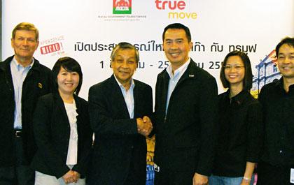 ทรูมูฟโดย นายเจริญ ลิ่มกังวาฬมงคล (ที่ 3 จากขวา) รองผู้อำนวยการ Wholesale Channel Partner Management ร่วมกับการท่องเที่ยวมาเก๊า โดย มร.อัลวิน เซ็กกา (ที่ 3 จากซ้าย) ผู้อำนวยการการท่องเที่ยวมาเก๊าประจำประเทศไทย จัดแคมเปญ “เปิดประสบการณ์ใหม่ที่มาเก๊า กับทรูมูฟ” ให้ลูกค้าใหม่ของทรูมูฟทั้งแบบเติมเงินและแบบรายเดือน (ยกเว้นแพคเกจทรูไลฟ์ฟรีวิวและจานแดงทรูวิชั่นส์ DStv ขายขาด ไม่มีรายเดือน) ที่เปิดใช้บริการตั้งแต่วันนี้ – 25 ตุลาคม 2551 ลุ้นรับแพกเกจท่องเที่ยวมาเก๊า พร้อมที่พัก 3 วัน 2 คืน รวม 80 รางวัล มูลค่ากว่า 1.6 ล้านบาท พร้อมมอบสิทธิ์ให้ผู้แทนจำหน่ายที่จำหน่ายซิมทรูมูฟให้กับผู้โชคดีลุ้นเดินทางสัมผัสเขตปกครองพิเศษมาเก๊า สาธารณรัฐประชาชนจีนด้วยเช่นกัน จับฉลากรายชื่อผู้โชคดีทุกวันที่ 25 ของเดือนกันยายน และตุลาคมนี้ ตรวจสอบรายชื่อผู้โชคดีที่ www.truemove.com